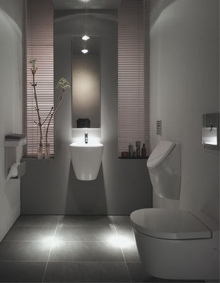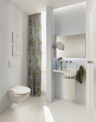 Die asymmetrischen Waschtische (in Rechts- und Linksversion lieferbar) erlauben eine relativ große Ablagefläche und Bewegungsfreiraum. Das patentierte Einbau-Urinal nutzt den Raum hinter der Vorwand und ermöglicht so durch eine Ausladung von nur 15 cm erstmalig den Einsatz in kleinsten Räumen. Das Wand-WC Joly zeichnet sich durch eine geringe Ausladung und geschlossene Seitenflächen aus. Die Glasablage mit Edelstahl-Siphonblende schafft offenen Stauraum. Wird der Waschtisch mit Boxette kombiniert, verschwinden nicht nur die Toilettenartikel, sondern auch die Installation. Schließlich erlauben die Accessoires von Keuco, in jedem Gäste-WC individuelle Akzente zu setzen.