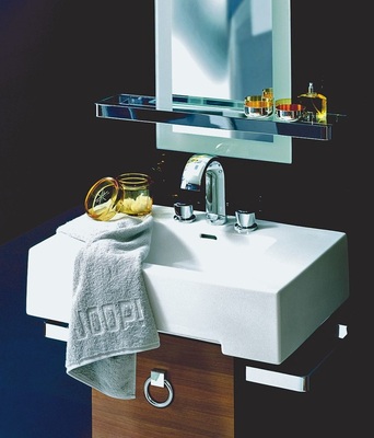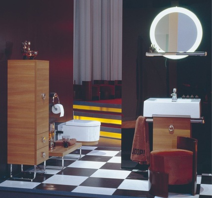 Modern Glamour – so beschreibt Joop! den Designanspruch, der zeitgemäße, moderne Formensprache mit Luxus verbindet. Die klare Silhouette mit starken Konturen zitiert aus dem Fundus der Bauhaus-Traditionen, opulente Details wecken Assoziationen an luxuriöse Hotelbäder, wertvolle Flakons oder Accessoires. Um den Joop!-Anspruch zu realisieren, hat Keramag eine Sanitärkeramik entwickelt, die durch großzügige glatte Flächen und hohe Materialstärken, kombiniert mit präziser Linienführung, eine hohe Wertigkeit vermitteln soll. Passend dazu das Möbelprogramm in weißem Lack, Nussbaum und Olive Hochglanz und unterschiedliche Lichtspiegel-Elemente.