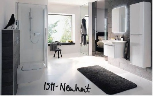 Möbel: Waschtisch-Unterschränke in verschiedenen Varianten, auch als Adaptermöbel erhältlich, Seitenschränke, Hochschrank, Lichtspiegelelement, 3D-Eckspiegelschrank, Spiegel, Möbelfarben: Korpus Weiß mit Fronten in Weiß Hochglanz, Wenge Hochglanz Dekor, Eiche lichthell Dekor.