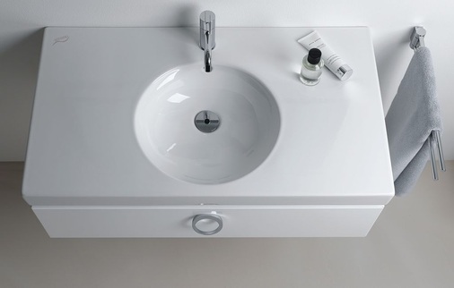 Prägendes gestalterisches Merkmal des neuen Möbelprogramms ist die reduzierte Formensprache sowie die direkte Anbindung der Möbelelemente an die Keramikobjekte. Im Sinne einer harmonischen Gesamtanmutung wurde bei den Möbeln auf aufgesetzte Griffe verzichtet. Die Schubladen, Auszüge und Türen lassen sich stattdessen mit Hilfe der integrierten Griffleisten öffnen. Dies wird durch eine 45°-Konstruktion erreicht, die das Design prägt. Zur Serienausstattung der hochwertigen Möbel in Hochglanz-Lack gehören Einteilungen in den Schubladen. Die Waschtischunterschränke und Hochschränke sind in den Farben Weiß und Anthrazit lieferbar.
