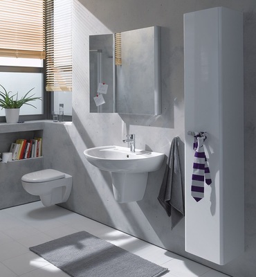 Vitelle spricht eine Zielgruppe an, die nicht nur täglich Komfort genießen möchte, sondern auch besonderen Wert auf Bewegungsfreiheit und Stauraum legt. Die Badserie bietet eine Vielzahl von Waschtischen und damit für unterschiedliche Grundrisse und Ansprüche passende Lösungen. Der Eckwaschtisch mit speziellem Unterschrank ist eine Einheit von Waschbecken und Ablage. Charakteristisch für den asymmetrischen Waschtisch sind außergewöhnlich große Ablageflächen links oder rechts. Für mehr Stauraum sorgen Waschtisch-Unterschränke, Seiten-, Hoch-und ein Hängeschrank. Spiegelschränke mit verschiebbarem Lichtspiegel komlettieren das Möbelsortiment. Darüber hinaus gehören verdeckte Befestigungen für WC und Bidet sowie die Kerafix-Befestigung bei der Halbsäule und dem Stand-WC zum Programm. Der WC-Sitz ist optional mit Absenkautomatik erhältlich. Zur Vitelle-Badserie passt das Urinal Pareo mit seiner geringen Ausladung von 240 mm.