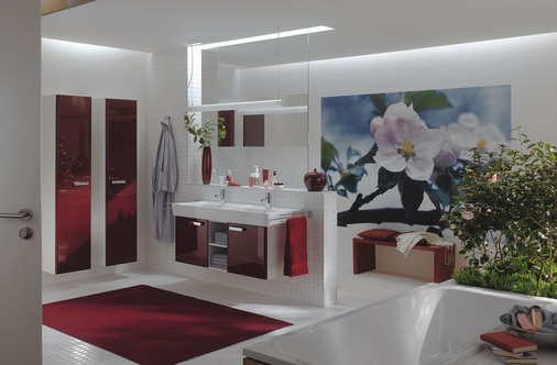 Waschtisch-Unterschränke, Seitenschränke, Hochschrank und Spiegelschränke; Möbelfarben: Korpus Weiß mit Fronten in Weiß Hochglanz, Zebrano Dekor Hochglanz, Wenge Dekor Hochglanz, Rubin Hochglanz