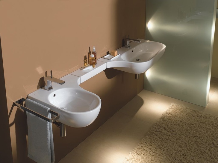 Das Standardsortiment umfasst zwei Handwaschbecken, vier Waschtische, ein wandhängendes bzw. bodenstehendes WC sowie ein wandhängendes Bidet. Außerdem ist eine Keramikablage verfügbar, die nicht nur Platz für Badaccessoires bietet, sondern – zwischen zwei Waschtischen platziert – für eine ungewöhnliche Optik sorgt. Formal anspruchsvoll und für besondere Anforderungen geeignet sind ein extrem schmaler Waschtisch mit besonders hoher Ausladung sowie ein asymmetrischer Waschtisch in 100 cm Breite. Eine asymmetrische Badewanne in zwei Versionen (rechts und links) kann mit einem Regal inkl. herausdrehbarer Stufe kombiniert werden und erleichtert somit den Einstieg in die Wanne für Jung und Alt.
