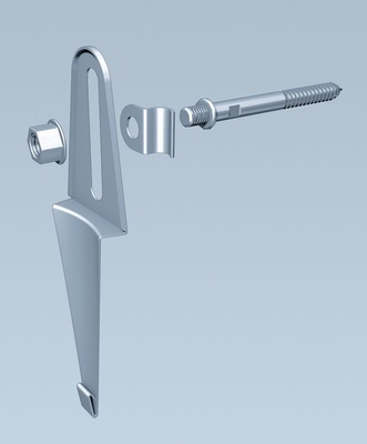 Eine Alternative zur klassischen Rohrschelle ist der Universal-Fallrohrhalter von Rheinzink. Er besteht aus den vier Komponenten Edelstahlhalter, Sperrzahnmutter mit Flansch, Blitzschutzhalter und Schraubstift (in drei Längen). Fertig montiert ist das Befestigungssystem weitgehend unsichtbar. Nur in der Seitenansicht und aus nächster Nähe ist der Halter als Winkel erkennbar. Das Ergebnis ist ein schellenloser Fallrohrstrang mit durchgehender, geradliniger Optik. Da keine verschraubbaren Teile vorstehen, wird die Verletzungsgefahr reduziert. Ein Vorteil, der besonders bei öffentlichen Gebäuden wie Schulen und Kindergärten von Bedeutung ist. Der Fallrohrhalter ist lotrecht über dem Standrohr in der Wand zu befestigen und wird direkt mittels Schraubstift oder durch einen Dübel mit dem Tragwerk verbunden. Im Rahmen der Montage wird das obere Fallrohr bzw. der Rohrbogen zunächst auf die Haltezunge des Universal-Fallrohrhalters gestellt. Das untere Fallrohr wird mit seiner Muffe über das obere Fallrohrende und den Halter geschoben. Der innerhalb der Muffe fest zwischen den Fallrohren eingeklemmte Edelstahlhalter garantiert nun den sicheren Halt des gesamten Fallrohrstranges. Das am Halter zur Aufnahme des Schraubstiftes vorgesehene Langloch ermöglicht dessen exakte Justierung und Lagesicherung. Nach dem Festziehen ist eine sichere Verbindung von Fallrohrhalter und Wandbefestigung gewährleistet.