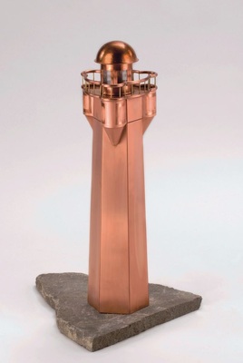 Licht ins Dunkel bringt Sascha Betzler aus Stuttgart mit seinem kupfernen Leuchtturm. Der Turmschaft besteht aus sechs nach innen gefalzten, 0,7 mm starken Segmenten, die punktweise verlötet sind und einer sechseckigen Bodenplatte. Am oberen Ende des Schaftes tragen drei Erker mit kegelförmiger Basis und unten eingeschraubter Messingkugel die Grundplatte für das Laternenhaus. Diese Aussichtsplattform aus 1 mm dickem Kupfer ist aus einem großen Kreis sowie drei kleinen, angesetzten Kreisen konstruiert und ringsum 4 mm hoch aufgekantet, damit das umlaufende Geländer aus genuteten, hartgelöteten Kupferrohren und Messingstäben aufgesteckt werden konnte. Der verglaste Laternenraum auf einer zweiten, unsichtbar angelöteten Kupferplatte wird durch eine Sicke in Position gehalten und ist darunter umgebördelt. Als Dach dient eine getriebene Halbkugel aus 0,8 mm starkem Kupfer.
