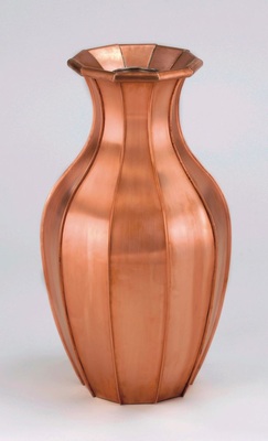 Die Kupfervase von Johannes Herrmann aus Pfullingen hat es im wahrsten Sinne des Wortes wirklich in sich: Denn der konische Einsatz im Vaseninnern, der zum Befüllen oder Leeren herausgenommen werden kann, besteht aus verzinntem Edelstahl (Uginox). Er wird am Vasenboden durch ein angelötetes Stück Kupferrohr fixiert, oben hängt man ihn an einer nach außen gezogenen Sicke in den Kranz der Kupfervase ein. Als Griff dient eine Drahteinlage oberhalb der Sicke. Der sichtbare, bauchige Teil der Vase besteht aus zehn Kupfersegmenten in 0,6 mm Stärke, die nach außen mit 5 mm hohen Falzen verbunden sind und einem zehnteiligen, gewulsteten Kranz als oberem Abschluss.