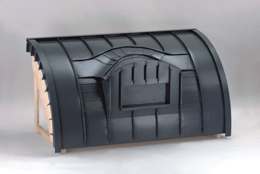 Eine regelrechte Dachlandschaft aus gefalztem, anthrazitfarbenem 0,7-mm-Aluminium konstruierte Sascha Ziegler aus Karlsruhe. Die Flächen seines Tonnendachs mit Gaube sind in Doppelstehfalztechnik mit 25 mm Falzhöhe eingedeckt. Zu beiden Seiten und oberhalb der Gaube sind die Felder mit doppeltem Liegefalz ausgeführt. Der Ortgangabschluss der Gaube besteht aus einem rund geführten Winkelstehfalz, mit dem die Scharen ihrer Front verfalzt sind. Dach und Gaubenwangen sind mit einer Faltenkehle angeschlossen, in die am Verschnittpunkt eine Seitenkehle eingehängt ist. Der Anfallspunkt von Gaubenfront, Kehle und Dachfläche wurde mit einer Quetschfalte hergestellt. Die Verbindungen der Ortgangscharen mit den Ortgangblenden sind durch eine Leiste hergestellt.