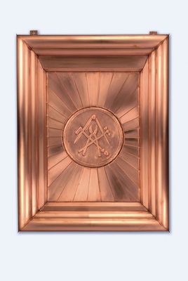 Die Leinwand des Klempners besteht aus Metall, dachte sich Michael Scharf aus Schwäbisch Hall und konstruierte als Meisterstück ein Klempnerwandbild mit Rahmen komplett aus Kupfer. Blickfang des Bildes ist das von Hand in einer CNC-gefrästen Holzplatte getriebene Klempnerwappen. Um dieses runde Emblem liegt wie ein Strahlenkranz eine rechteckige Faltentreppe, die aus 0,7 mm starkem Kupfer durch 10 mm breite Doppelkantungen in zwei Hälften hergestellt wurde. Das Profil des Bilderrahmens besteht aus drei Elementen: einem geraden innen und zwei gerundeten in der Mitte und an der Außenseite. Untereinander sind die drei Rahmenteile mit 8mm breitem Schnappfalz verbunden. Die Gehrungen des äußeren Profilteils wurden mit 5 mm hohen Falzen geschlossen, die der beiden anderen Elemente nach innen gebördelt und WIG-geschweißt. Die Verbindung zwischen Rahmen, Faltentreppe und Klempnerwappen besteht jeweils aus einfachen Falzen.