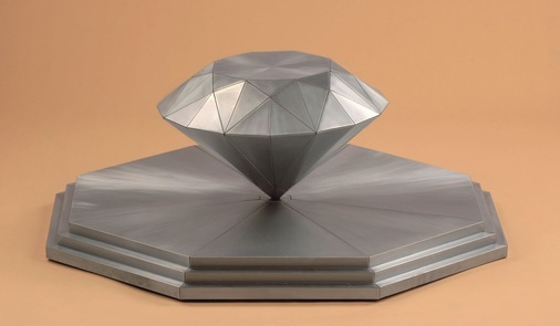 Mit 41 cm Durchmesser ist der Diamant von Norbert Reichel aus Rheinstetten sicher etwas zu groß für den Ringfinger. Deshalb steht das Meisterstück, das er aus 0,7 mm starken Zink-Facetten gefertigt hat, auf einem stabilen achteckigen Zinksockel mit Stufen. Die Form eines geschliffenen Brillanten ist aus 64 dreieckigen Flächen und einem großen Achteck auf der Oberseite, der so genannten Tafel, konstruiert. An der Unterseite, wo der Brillantschliff in einem kleinen Fuß, der so genannten Kalette, ausläuft, ist der Zink-Klunker mit Schraube M8/80 mm und Mutter an einem 60 mm messenden Achteck inmitten des Sockels und der hölzernen Unterkonstruktion befestigt. Alle Segmente wurden mit dem Zinkreißer vorbereitet, mit einfachem Falz um 5 mm nach innen gefalzt und punktuell gelötet. Nachdem sämtliche Facetten miteinander verbunden waren, wurde ganz zum Schluss die Tafel des Brillanten eingesetzt.