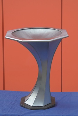 Vielleicht hatte Reinhold Derfuß aus Großenbuch die Idee, mit seinem achteckigen Zimmerbrunnen aus Titanzink für angenehmes Raumklima durch Luftbefeuchtung zu sorgen. Oder sollte der Brunnen vielleicht gar kein Wasser spenden? Was in dem mit Hilfe eines Kraftformers getriebenen Becken auch sprudeln mag – nichts dürfte über den Wulst hinauslaufen, der Außenteile und Schale verbindet. Somit dürfte auch der Standfuß, dessen 18 Scharen durch einfache, 4 mm hohe Stehfalze verbunden sind, trocken bleiben.