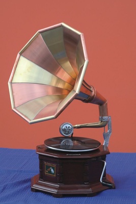 Für den Freund von Blechmusik hat Christian Demel aus Kirchzell ein ganz spezielles Gerät anzubieten. Leicht vorverstellbar, dass aus seinem zweifarbigen Grammophon-Trichter in 0,6 mm starkem Kupfer und Messing schmissige Märsche von Schellack-Platten scheppern. Jeweils sechs Elemente pro Material sind immer abwechselnd angeordnet und durch Falzen und Löten miteinander verbunden. Eingefasst wird der Trichter durch längs genutete Kupfer- und Messingrohre, die auf Gehrung geschnitten und verlötet sind. Der Anschlussbogen ist als Rohrwinkel mit einem 3 mm hohen Querfalz ausgeführt und auf einer Seite mit Drahteinlage versehen.