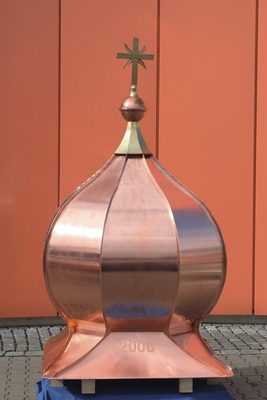 Im 17. Jahrhundert wäre Markus Grüner aus Floß angesichts seiner barocken Zwiebelhaube bestimmt sofort von einem Kirchenbaumeister angeheuert worden. Die übermannshohe, achteckige Zwiebel auf quadratischer Grundfläche hat er aus 0,6 mm starken Kupferscharen hergestellt, die er mit Gratfalzen in Doppelstehfalztechnik verband. Um das Eindringen von Regenwasser zu verhindern, sind die Falze an den Graten in wechselnden Richtungen angebracht. Die Ecken am Dachknick sind rund herausgefalzt. Als Dachspitze dient ein Messingkreuz auf einer Kupferkugel, die auf einem geschwungenen Fuß aus stumpf verlötetem Messing sitzt.