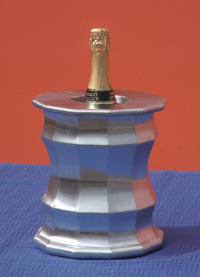 Für wirklich kühlen Sekt braucht es auch einen kühnen Entwurf. So dachte Frank Wiloth aus Gottenheim und entwickelte ein schwungvolles Gefäß aus Titanzink, um die prickelnden Tropfen richtig zu temperieren. Aus 26 Einzelsegmenten fertigte er Außenschale und Flaschenhalter. Die Segmente des Innenteils sind überlappt gelötet, die des Außenteils stumpf. Jeweils ein Wulst bildet den oberen und unteren Randabschluss des Sektkühlers.