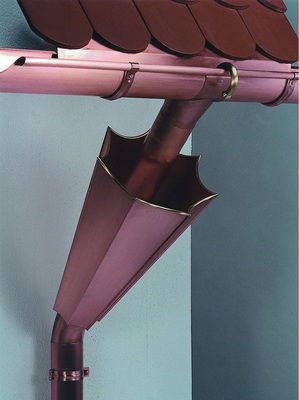 Die neueste Variante ist ein spezieller Rinnenverbinder. Eine Spannautomatik sorgt für dauerhaften Anpressdruck, wobei zur Montage des Verbinders nicht einmal die Dachpfannen oder Traufprofile entfernt werden müssen. Ein weiteres Rinnenverbindungs-System kommt sogar ohne zusätzliche Metall-Bauteile aus. Dabei werden mit einem speziell entwickelten Werkzeug zwei sickenförmige Vertiefungen am Rinnenende angebracht, die spezielle Gummidichtungen aufnehmen und dadurch für Dichtheit sorgen. Ebenso vielfältig, wie die Möglichkeit zur Nahtverbindung, ist der Gestaltungsspielraum. Für nahezu jedes Bedachungsmaterial ist das passende Dachentwässerungszubehör erhältlich. Ob Aluminium walzblank oder farbbeschichtet, Edelstahlrinnen mit oder ohne verkupferte Oberfläche, Kupferdachrinnen mit oder ohne werkseitige Patinierung – die Vielfalt ist enorm. Selbst passende Rinnenhalter und Rohrschellen sind lieferbar, etwa als patinierter Kupferhalter, als zinkummantelter Rinnenhaken oder als Rinnen-Halter-Blende mit verschiedenen Oberflächenqualitäten. Längst nicht so viele Meinungsverschiedenheiten gibt es bei den Rinnenkesseln. Hier haben sich, zumindest was die Standards anbelangt, industriell gefertigte Modelle zwar durchgesetzt – Sonderbauteile hingegen fertigen die Klempner noch immer mit viel Liebe zum Detail selber an.