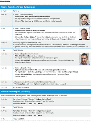 Begleitet wird das Programm von einer Fachausstellung, außerdem wird der „Digital Award Handwerk“ vergeben. Beginn ist am 9. November um 9.30 Uhr, das Ende ist voraussichtlich gegen 17 Uhr. Die Referenten des Vormittags leiten am Nachmittag stattfindende Workshop-Gruppen zur Vertiefung ihrer Themen bzw. zur Anleitung bei der praktischen Umsetzung.
