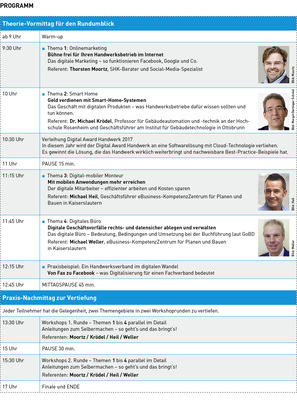 Begleitet wird das Programm von einer Fachausstellung, außerdem wird der „Digital Award Handwerk“ vergeben. Beginn ist am 9. November um 9.30 Uhr, das Ende ist voraussichtlich gegen 17 Uhr. Die Referenten des Vormittags leiten am Nachmittag stattfindende Workshopgruppen zur Vertiefung ihrer Themen bzw. zur Anleitung bei der praktischen Umsetzung.