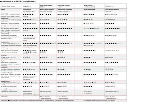 Neben programmtechnischen Aspekten (Systemvoraussetzungen, Updates / Upgrades, Einarbeitung / Schulung, Support etc.) spielen bei der Auswahl des richtigen Berechnungswerkzeugs vor allem praktische Fragen eine Rolle: Für welche Anlagengröße ist die Software geeignet? Werden alle wichtigen Betriebsarten, wie wärme-, strom-, netzgeführt, modulierend, mono-/bivalent etc. berücksichtigt? Auch hinsichtlich der Antriebstechnologie unterscheiden sich die Programme teilweise erheblich.