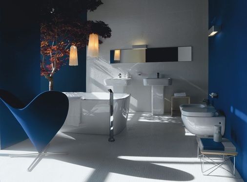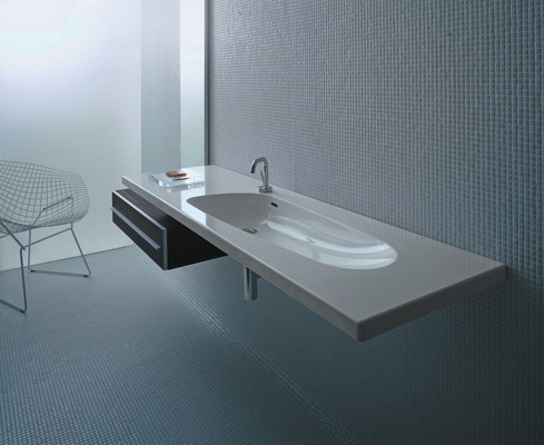 Die Palomba Collection ist eine Bad-Serie aus Waschtischen, Waschschalen, Wanne, Duschtassen, WCs und Bidets, die virtuos mit Grenzwertigem spielt und Geometrie und Organisches liebevoll in Keramik abbildet. Für die Designer Roberto und Ludovica Palomba stand bei diesem Konzept das Meer Pate – sie nennen dies „fingerprint of nature“. Die Formen sind für den Werkstoff Keramik recht ungewöhnlich, wie zum Beispiel beim asymmetrischen Waschtisch: Basis ist ein Waschtischpaneel, das in rechten Winkeln ausgeführt ist und wie eine vor der Wand schwebende Tischplatte wirkt – das Becken ist sanft wie eine Lagune eingebettet. Die Waschschalen der Palomba Collection gehen im Stil einen ähnlichen Weg: Ein Kubus wird verrundet als Symbol für die höhlende Wirkung des Wassers. Eine Wanne aus hautsympathischem Sanitäracryl und zwei Duschtassen erweitern den Spielraum der Palomba Collection im Badezimmer. Noch mehr Komfort beim Baden verspricht die optional erhältliche Ausführung der Wanne als Whirlpool. Ergänzt wird die Palomba Collection durch passende Möbel, Leuchten und Spiegel. Die Serie versteht sich als veritables Baustein-Angebot für hochwertige Innenarchitektur – und wird nach und nach um weitere Elemente ergänzt.