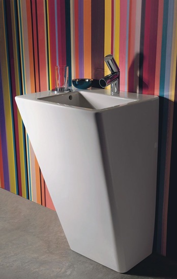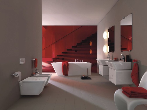 Diese Oberflächen laden geradezu ein, Badutensilien darauf abzustellen. Ihre Wirkung ist nah am Architektur-Objekt. Das gilt insbesondere für den eindrucksvollen, 90 Zentimeter hohen Waschtisch, der in traditioneller Feinfeuerton-Technik hergestellt wird, bis hin zur verchromten Seifenschale. Die Möbel nehmen diese Formensprache auf, suchen die harmonische Verbindung zur Bad-Keramik.