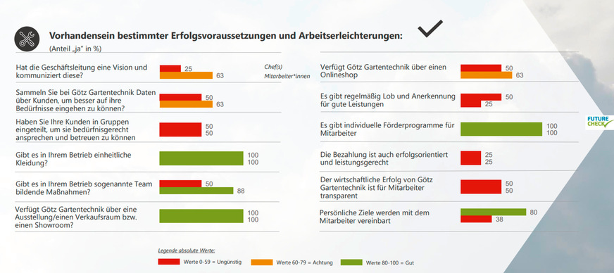 Der FutureCheck beinhaltet eine Onlinebefragung, die sich in jeweils angepasster Form an Kunden, Mitarbeiter und die Geschäftsführung richtet. Im Kern geht es dabei um die elf Erfolgsfaktoren einer lokalen Arbeitgebermarke. Beleuchtet werden die drei Bereiche Team und Strategie, Kunden und Kommunikation, Leistung und Produkte. Und natürlich: Motivation. Wichtig ist, es handelt sich nicht um einen einmaligen Vorgang, der Prozess ist auf rund ein Jahr ausgelegt, kann aber beliebig wiederholt werden – was zu verbessern gibt es immer. Dann werden die Entwicklungsergebnisse überprüft und mögliche zukünftige Schritte festgelegt.