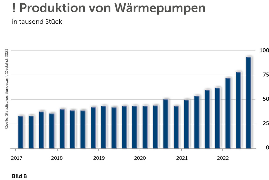 Die genannten Mengen kommen außerdem zusätzlich zu den bereits vorhandenen und oftmals schon stark ausgeweiteten Fertigungskapazitäten. So ist die Produktion von Wärmepumpen laut dem Statistischen Bundesamt (Destatis) bereits in den ersten drei Quartalen 2022 um 49 % gegenüber Vorjahreszeitraum auf knapp 243.200 Stück gestiegen. Allein im dritten Quartal 2022 wurden in Deutschland 93.500 Wärmepumpen gefertigt (Bild B).