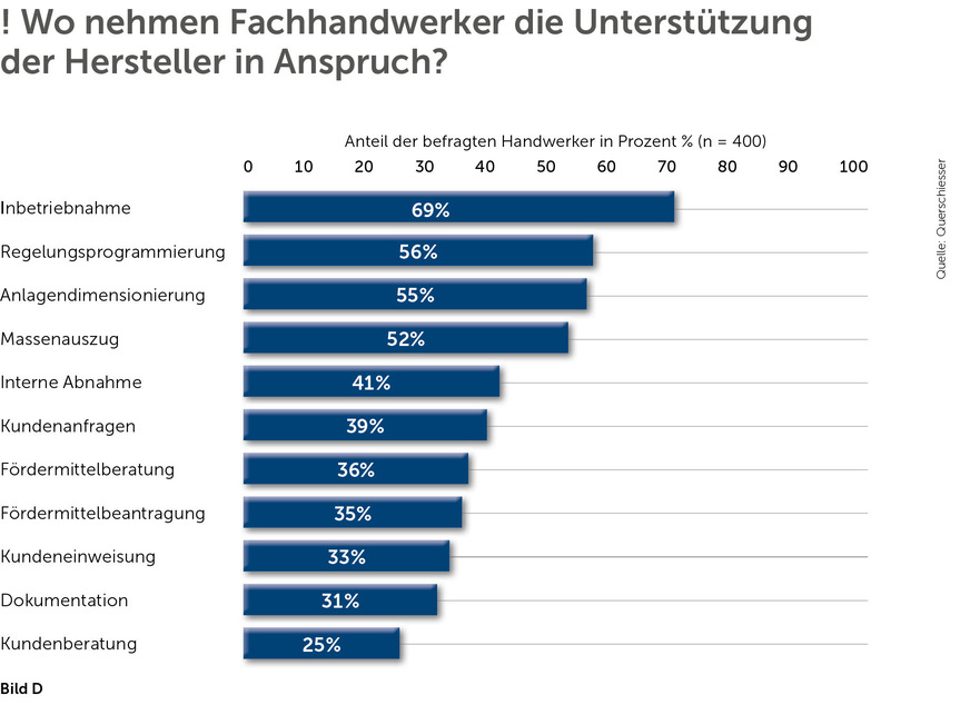 Im Durchschnitt setzen die befragten Handwerker für die Umsetzung einer Wärmepumpenanlage von der ersten Beratung über die Installation bis hin zum Nachservice 81 Stunden an (Bild C). Davon werden 63 Stunden (78 %) vom SHK-Betrieb selbst übernommen. 18 Stunden (22 %) fangen bereits heute die jeweiligen Hersteller durch verschiedene Unterstützungsleistungen auf. Besonders hoch im Kurs stehen die Auslegung und Inbetriebnahme, aber auch Dienstleistungen rund die Förderung sind gefragt (Bild D).