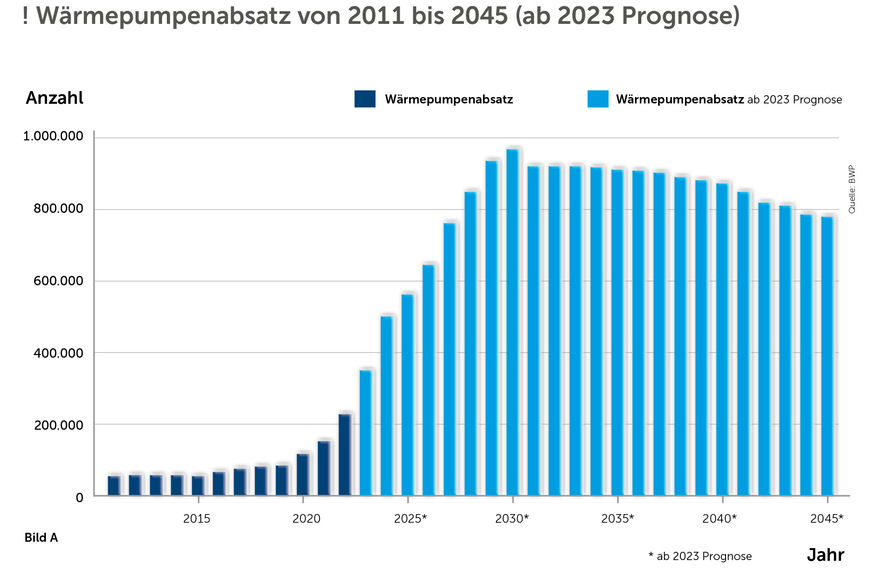 Dass 500.000 Wärmepumpen pro Jahr nicht das Ende der Fahnenstange sind, dürfte angesichts eines Gesamtmarkts für Wärmeerzeuger von knapp einer Million Geräte jedem klar sein. Der BWP geht in seiner Branchenstudie 2023 davon aus, dass der Markt bis zum Ende des Jahrzehnts bei jährlichen Installationszahlen von etwas weniger als einer Million Wärmepumpen liegt (Bild A).
