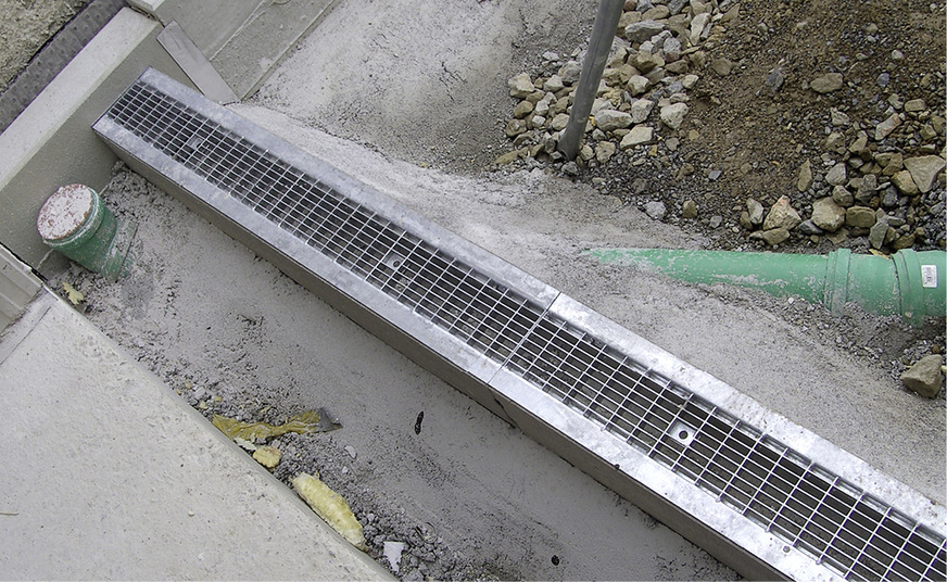 Wieder einmal eine Kuriosität. Die Entwässerungsrinne wurde ohne Senkkasten (mit Schmutzkorb) und ohne Geruchsverschluss direkt ans Kanalnetz angeschlossen (klar, bei Schlechtwetter: Kanalgeruch). Der KG-Muffenstopfen ist für den Anschluss des Regenrohres vorgesehen. Zudem befindet sich direkt unter der Beton-Entwässerungsrinne das KG-Rohr mit einem Abzweig.