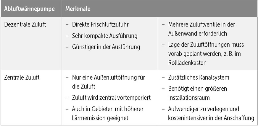 Die Tabelle dient als Entscheidungshilfe zur Auswahl der passenden Ausführung und vergleicht die Merkmale von zentraler und dezentraler Abluft: