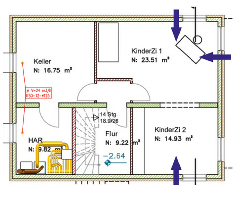 Anschließend wird die Lüftungsplanung erstellt, wobei der Volumenstrom berechnet und eine Positionierungsempfehlung gegeben wird.