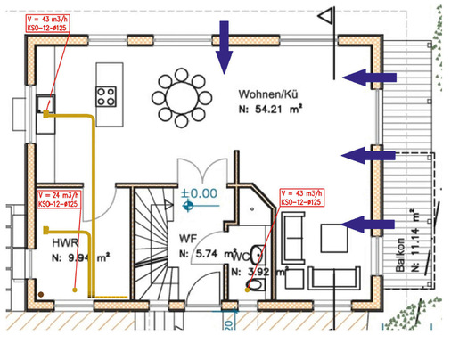 Die verbrauchte Luft des Hauses wird immer zentral über ein Lüftungskanalnetz und über die Wärmepumpe aus den Ablufträumen abgeführt. Letztere sind häufig so angelegt, dass sich die Lüftungsverrohrung mit einem kurzen und dadurch kostengünstigen Kanalnetz umsetzen lässt. Die Zuluft kann entweder dezentral über Frischluftventile oder zentral über ein zusätzliches Zuluftkanalnetz in die Wohnräume gelangen. Überströmräume, wie beispielsweise Flure, besitzen keine eigenen Lüftungsventile. Daher werden sie in der Lüftungsplanung als Überströmbereiche betrachtet und unterliegen somit dem erforderlichen Luftaustausch.