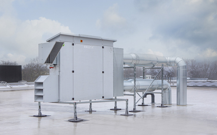 Zum Zuge kamen hierbei vier Geräte der Serie Vallox Commercial Line Vario. Diese Lüftungssysteme bieten eine effiziente zentrale Frischluftzufuhr mit Wärmerückgewinnung, die speziell für den Einsatz in mehrgeschossigen Wohngebäuden, gewerblichen Objekten, Schulen und Kindergärten konzipiert wurde. Die Geräteserie besteht aus sieben Modellen im Luftleistungsbereich bis 6000 m³/h. Das Ingenieurbüro entschied sich für ein Vario 1700, zwei Vario 1100 und ein kleineres Vario 660 mit entsprechend reduzierter Lüftungsleistung.