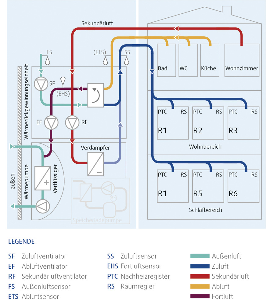 Die hohe Leistung zur Erwärmung beziehungsweise Kühlung der Wohnräume ergibt sich zudem aus dem Sekundärluft-Prinzip. Um beispielsweise über eine Anhebung des Volumenstroms mehr Kühlleistung bereitzustellen, entnimmt die Kompaktanlage über einen weiteren Luftkanal den Zulufträumen bereits temperierte Luft, kühlt sie über die reversible Luft/Luft-Wärmepumpe weiter ab und führt sie zusammen mit dem konstanten Außenluft-Volumenstrom der Wohnung wieder zu. Gleichzeitig wird die Temperatur der warmen Außenluft über einen Rotationswärmeübertrager durch die kühlere Abluft abgesenkt.