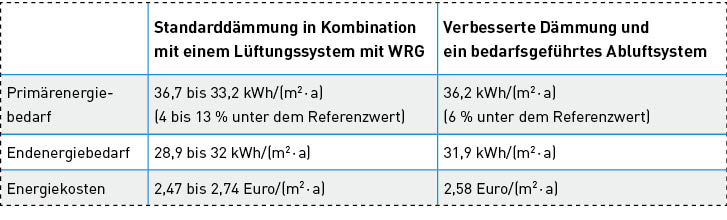 Es gibt also zwei Möglichkeiten, den Anforderungen gerecht zu werden, nämlich mit einer Standarddämmung in Kombination mit einem Lüftungssystem mit WRG oder durch verbesserte Dämmung und ein bedarfsgeführtes Abluftsystem.