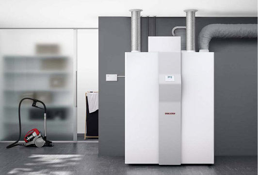 Stiebel Eltron hat ein Gerät entwickelt, das niedrige Jahresheizwärmebedarfe von weniger als 15 kWh/m 2 a beziehungsweise eine benötigte Heizleistung von weniger als 10 W/m 2 bedient und die Warmwasserbereitung übernimmt. Die Wärme wird dabei über die integrierte Lüftungsanlage in das Gebäude eingebracht. Die LWZ 604 Air vereint kontrollierte Wohnungslüftung, Inverter-Wärmepumpe und einen 200-l-Trinkwarmwasserspeicher. Dabei ist die Nutzung der Lüftungsanlage als Wärmeverteilsystem dann wirtschaftlich, wenn die Frischluftmenge, die von der Lüftungsanlage eingebracht wird, für den Wärmetransport ausreicht. Einen solch niedrigen Wert erreichen die Gebäude nur mit einer dichten Gebäudehülle – die eine kontrollierte Wohnungslüftungsanlage benötigt. Die LWZ 604 Air stellt bei –20°C Außentemperatur eine reine Leistung von 3,2 kW bereit. Damit kann auch die Warmwasserbereitung bedient werden. Gleichzeitig ist für die Heizung eine Leistungsreserve vorhanden. Das Gerät verfügt zudem über eine große Modulationsbandbreite, für die ein zusätzlicher Mini-Puffer eingesetzt wird, damit über die Lüftungsanlage kontinuierlich geheizt werden kann. Die Leistungszahl liegt bei 4,52 bei 2 °C Außentemperatur und 42°C Zulufttemperatur und für die Warmwasserbereitung bei 2,8 beim Zapfprofil XL nach EN 16147. Das Gerät verfügt über eine Anschlussmöglichkeit für einen Wasser-Heizkreis, der für die Beheizung der Ablufträume eingesetzt werden kann.