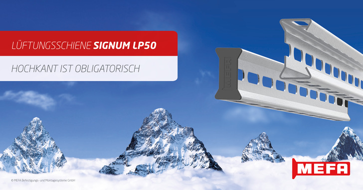 Ziel war es, ein lageraufwand-schonendes, schlankes Sortiment anzubieten: Dazu gehört die Schiene Signum LP50 (die Buchstaben-Zahlen-Kombi steht für Lüftungsprofil in der Schienenhöhe 50 mm) in verfügbaren Längen von 2 und 6 Metern. Zur Schiene gibt es eine Schutzkappe für die Enden, eine Schallentkopplung für den Luftkanal sowie fertig vorkonfektionierte Wandhalter.
