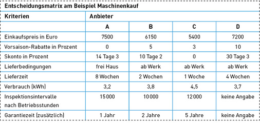 Jede Entscheidung dient einem Ziel. Vor dem Beschluss gilt es also genau zu definieren, was damit erreicht werden soll und wie die Kriterien gewichtet werden. Dabei hilft es, die einzelnen Parameter in einer Matrix aufzuführen, wie oben stehendes Beispiel der Anschaffung einer Maschine zeigt. Was hat Priorität: der Anschaffungspreis, die Leistung einer Maschine oder der Verbrauch? Dabei gibt es Muss-Anforderungen, die unbedingt erfüllt werden müssen, und Soll-Anforderungen, auf die es erst in zweiter Linie ankommt. Zwei Soll-Anforderungen haben den gleichen Wert wie eine Muss-Anforderung. Vom „Überstrahlungseffekt“ spricht man, wenn ein Parameter alle anderen überwiegt, also alleinig ausschlaggebend ist. Wenn beispielsweise geringe Kosten bei einer Investition im Moment extrem wichtig sind, ist der Anschaffungspreis das Killerkriterium und alle teureren Optionen scheiden aus. Allerdings kann das aktuell wichtigste Kriterium, meist ist es der Preis, langfristig an Bedeutung verlieren. Später rücken der Verbrauch, die Wartungskosten und andere Aspekte in den Vordergrund. Dies sollte man von Anfang an bedenken.