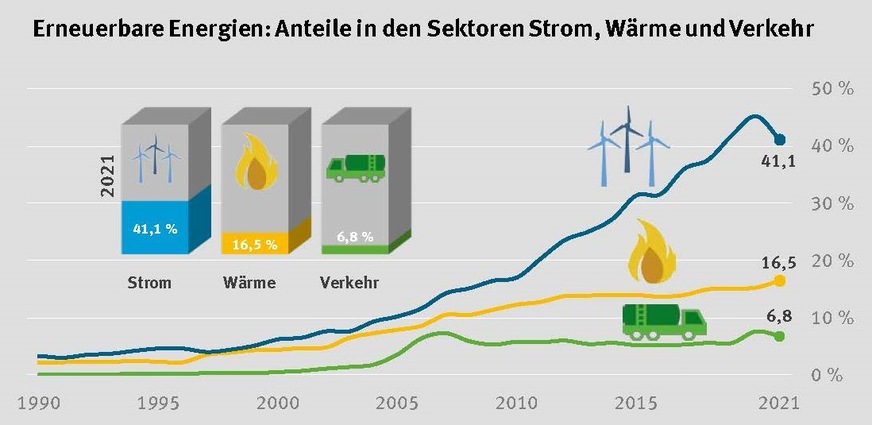 Maßgeblich war insbesondere, dass aufgrund des kalten Winters mehr erneuerbare Energien für Wärme und Kälte genutzt wurden. Deshalb – und weil zusätzlich der für die Berechnung des Anteils maßgebliche Heizölabsatz infolge hoher Lagerbestände und steigender Ölpreise rückläufig war – erhöhte sich der Anteil erneuerbarer Wärme deutlich von 15,3 auf 16,5 % im Jahr 2021. Der Wärme- und Kältebereich steht für mehr als die Hälfte des gesamten deutschen Bruttoendenergieverbrauchs.
