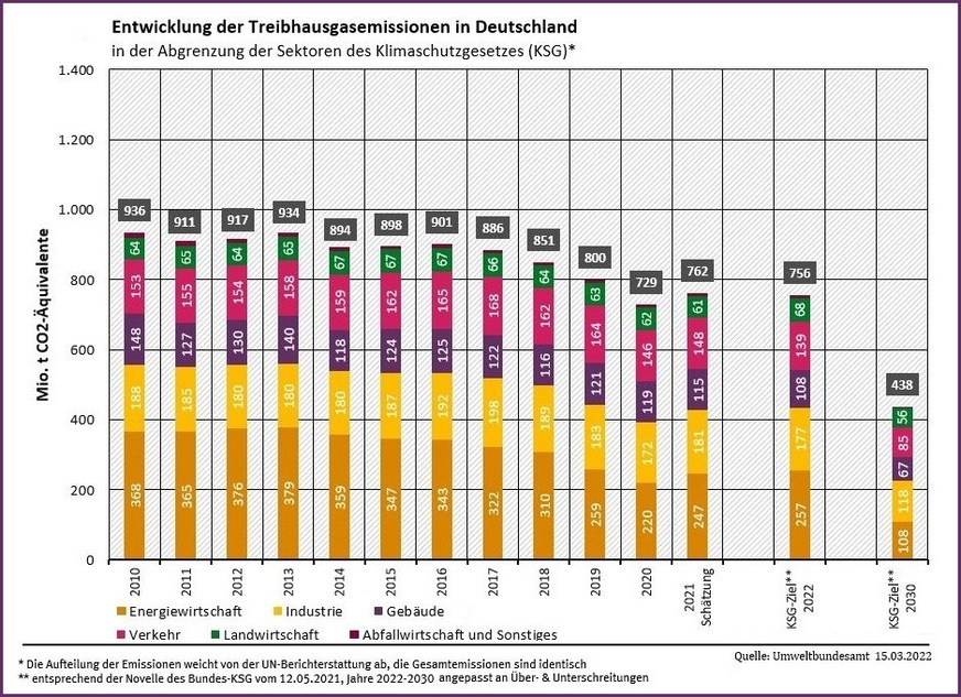 Der Anstieg im Jahr 2021 ist insbesondere im Energiesektor zu verzeichnen: Dieser weist ein Plus von 27 Mio. t CO2e auf, da wegen gestiegener Stromnachfrage, geringerer Stromerzeugung aus erneuerbaren Energien und des gestiegenen Gaspreises verstärkt Kohle zur Stromerzeugung genutzt wurde. Die Sektoren Verkehr und Gebäude liegen über den im KSG festgelegten Jahresemissionsmengen.