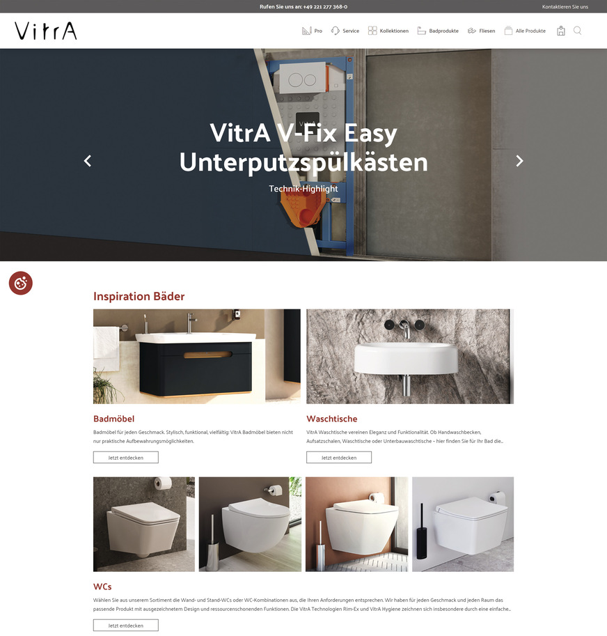 Auf der Startseite sehen Besucher*innen die Highlights aus dem Portfolio, Bilder weisen den Weg zu den Badkollektionen. Magazinbeiträge, ein Showroom und Portfolios bieten Anregungen für die Gestaltung privater Bäder sowie für das Objektgeschäft.