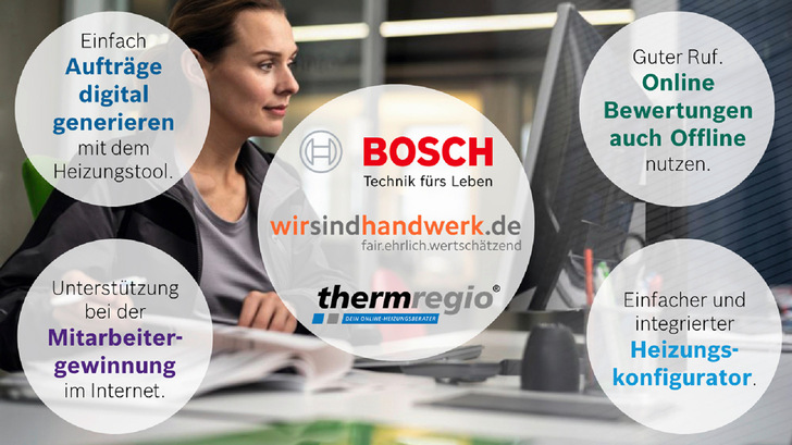 Industrie, Handwerk und Onlinemarketing im Schulterschluss: Die Heizungsmarke Bosch, thermregio und wirsindhandwerk.de bieten Fachhandwerkern unter anderem digitale Unterstützung bei Onlineauftritt; On- und Offlinewerbung, dem Reputationsmanagement und der Auftragsgenerierung. Dabei stehen die Optimierung und Verknüpfung der bereits entwickelten digitalen Tools im Fokus. Die schnelle und einfache Bearbeitung der Kundenanfrage für eine neue Heizung durch die Heizungsrechner von Bosch und thermregio führt zu zufriedenen Endkunden, die dies durch positive Bewertungen auf wirsindhandwerk.de äußern. Durch ein angebundenes Reputationsmanagement können die im Internet so wichtigen Kundenbewertungen optimal online sowie offline für den Handwerker genutzt werden.