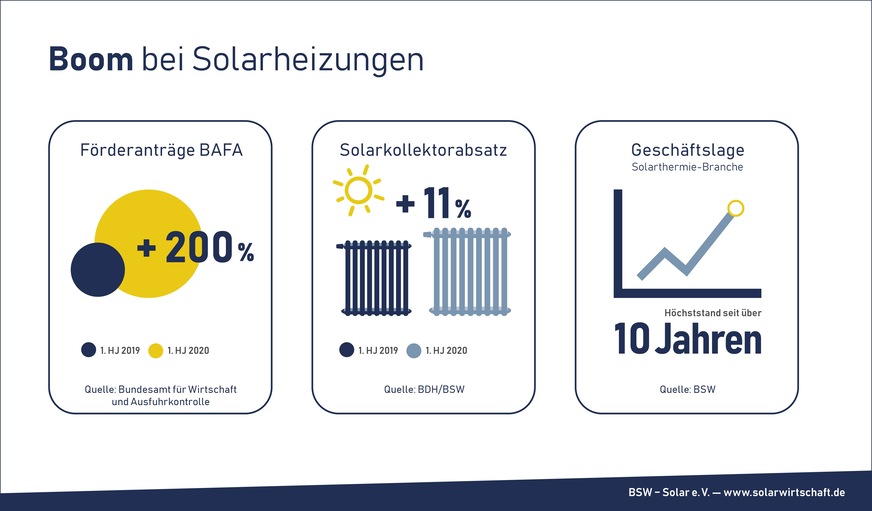 Die zu Jahresbeginn deutlich verbesserten Förderkonditionen für Solarwärme-Anlagen im Rahmen des neu aufgelegten Marktanreizprogramms (MAP) greifen. Im ersten Halbjahr 2020 sind über 200 % mehr Solarthermie-Förderanträge gestellt worden als im Vorjahr. Dies geht aus jetzt vom Bundesamt für Wirtschaft und Ausfuhrkontrolle (BAFA) veröffentlichten Zahlen hervor. So wurden im ersten Halbjahr 2020 insgesamt 26.991 Anträge gestellt, gegenüber 8.700 Anträgen im vergleichbaren Vorjahreszeitraum. Solarheizungen werden seit Anfang 2020 im Förderprogramm „Heizen mit Erneuerbaren Energien" mit bis zu 35 % – beim Austausch einer Ölheizung sogar mit bis zu 45 % – bezuschusst. Nach Angaben des Bundesverbandes Solarwirt-schaft e. V. (BSW) nutzen bereits 2,5 Millionen Haushalte in Deutschland Solarthermie-Anlagen für die Erzeugung von Raumwärme oder zur Brauchwasser-Erwärmung.