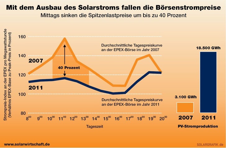 Der meiste Solarstrom wird vom späten Vormittag bis in den Nachmittag hinein erzeugt, also in den Zeiten der Spitzenlast. Genau in dieser Zeit ist der Börsenstrom am teuersten. Die IZES-Studie belegt, dass mit dem wachsenden Zubau an Solarstrom die Preise für sogenannten Spitzenstrom von 2007 bis 2011 kontinuierlich gesunken sind. Spitzenstrom wird im Spothandel an der Leipziger EPEX-Börse gehandelt, in der Zeit von 8 bis 20 Uhr. Mittags senkt Solarstrom die Preise sogar um bis zu 40 %. Die Industriestrompreise sind durch den Kostensenkungseffekt um rund 0,15 Cent pro kWh niedriger. Der Effekt kommt vor allem Großhändlern und Großverbrauchern zugute. Die privaten Verbraucher hingegen spüren davon nichts. Im Gegenteil: Für sie verteuert sich die EEG-Umlage, weil sie für die Differenzkosten zwischen billigem Spitzenstrom und Einspeisevergütung aufkommen müssen.