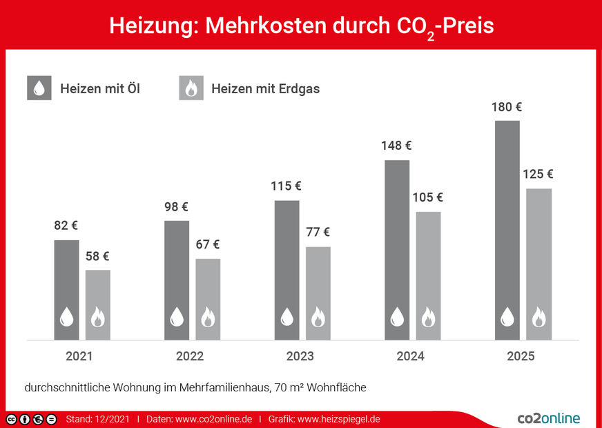 • Der 2021 eingeführte CO2-Preis steigt zum Jahreswechsel von 25 auf 30 Euro je Tonne. Laut co2online bedeutet das für einen durchschnittlichen gasbeheizten Haushalt mit 70 Quadratmetern Wohnfläche jährliche Mehrkosten von etwa 65 Euro. Haushalte, die mit Öl heizen, zahlen im Schnitt rund 100 Euro mehr.