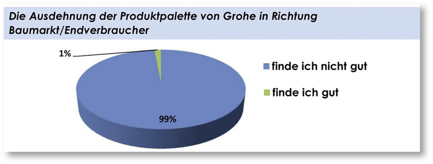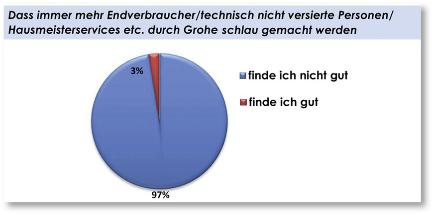 Das SHK-Handwerk hat sich den Film nämlich auch sehr aufmerksam angeschaut und hat Ihre Botschaft verstanden. Für den Einbau von Grohe-Armaturen braucht es keinen Handwerker. Das Problem: Der Handwerker entschlüsselt diese Botschaft für sich und kommt irgendwie auf eine andere Schlussfolgerung als der umworbene Endkunde: ‚Warum soll ich noch Grohe-Armaturen einbauen, wenn das so kinderleicht ist? Da fragt mich doch der Kunde, warum ich so dreist bin, dafür eine Handwerkerstunde von 70 Euro abzurechnen.‘