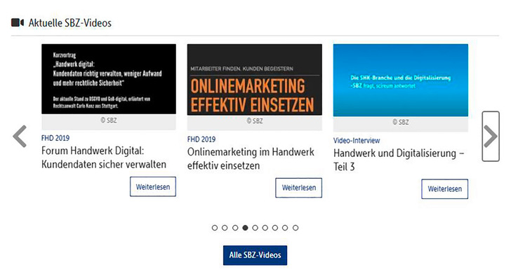 Welchen Nutzen ziehen SHK-Fachhandwerksbetriebe aus der Digitalisierung? Wie z. B. werden Kundendaten sicher verwaltet: von der Angebotserstellung über die Rechnungslegung und die Verwaltung von Kunden- und Produktdaten? Wie funktioniert Onlinemarketing? Weshalb haben die Online-Kundenportale der Großhandelshäuser in den letzten Jahren eine so gute Entwicklung hingelegt und welche Funktionen bieten sie jetzt den Fachbetrieben? Antworten auf alle diese Fragen geben die SBZ-Videos. Auf der Website www.sbz-online.de gibt es neu im Nachrichtenbereich ein „Schaufenster“ mit interessanten Beiträgen – nicht nur zur Digitalisierung.