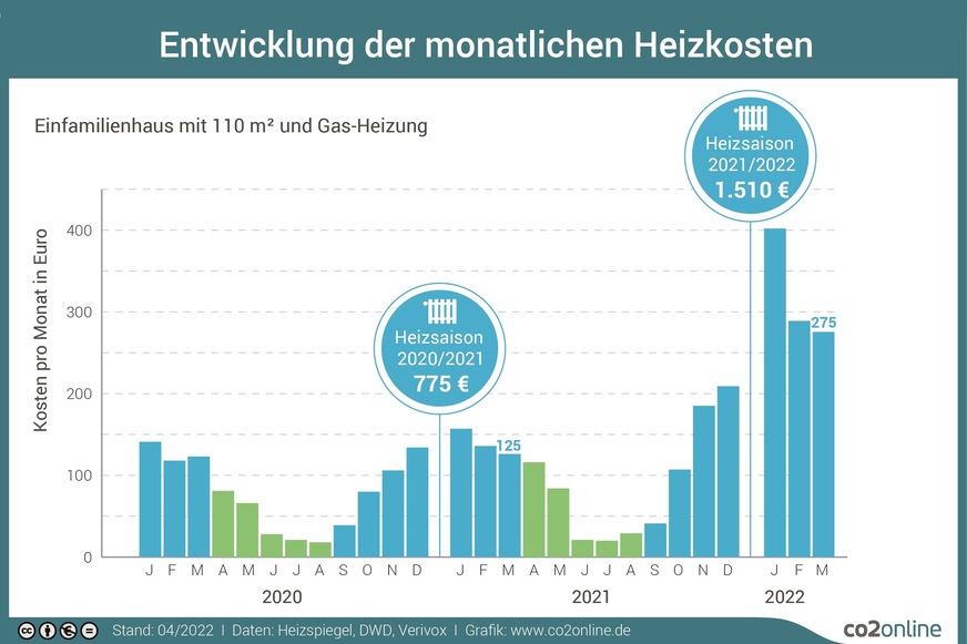 Bei einem Einfamilienhaus sind die monatlichen Kosten im Schnitt um 150 Euro gestiegen (ebenfalls + 119 %). Das betrifft nach einer Schätzung von co2online etwa 100 000 Haushalte in Deutschland.