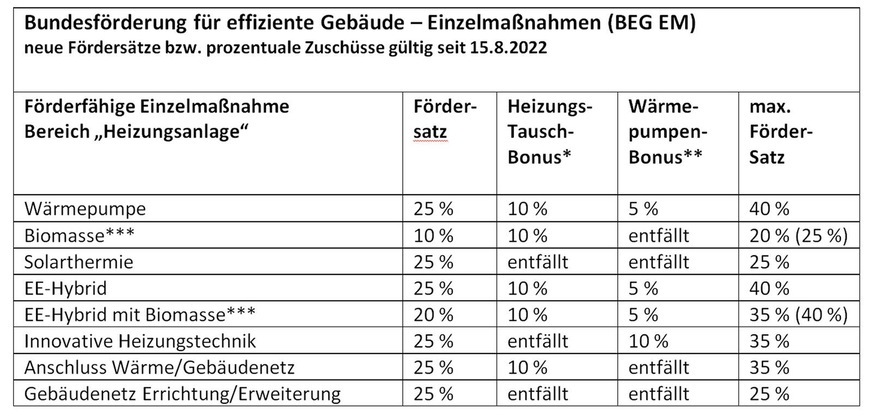 Nachfolgend werden die einzelnen BEG EM-Bereiche im Kurzüberblick mit den neuen Fördersätzen und den wichtigsten Inhalten dargestellt. Wesentliche inhaltliche Änderungen gab es prinzipiell nur im Bereich „Heizungstechnik“.