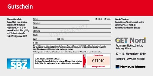 Nehmen Sie Ihre Mitarbeiter mit auf die Fachausstellung. Den hier abgebildeten Gutschein für Ihren Eintritt zur Get Nord können Sie sich unter https://www.sbz-online.de/tags/extras-zum-heft beliebig oft herunterladen.
