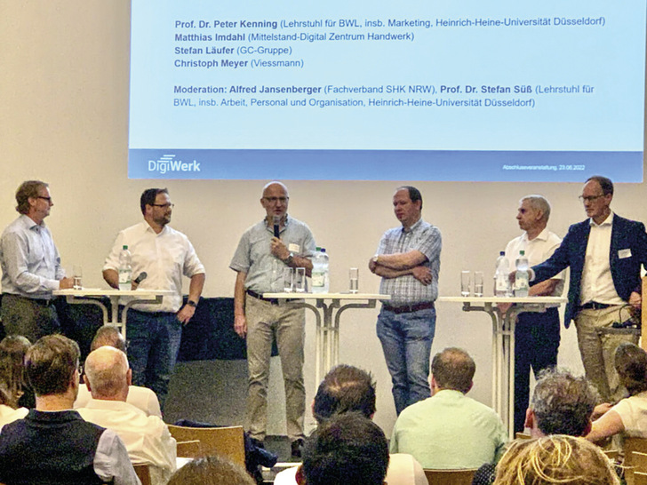 Im Rahmen einer Podiumsdiskussion diskutierten außerdem die Moderatoren Alfred Jansenberger (Fachverband SHK NRW) und Prof. Dr. Stefan Süß (Lehrstuhl für BWL, insb. Arbeit, Personal und Organisation, Heinrich-Heine-Universität Düsseldorf) mit Matthias Imdahl (Mittelstand-Digital Zentrum Handwerk), Prof Dr. Peter Kenning (Lehrstuhl für BWL, insb. Marketing, Heinrich-Heine-Universität Düsseldorf), Stefan Läufer (GC-Gruppe) und Christoph Meyer (Viessmann) über den sich verändernden Wettbewerb durch die Digitalisierung und die damit verbundenen Chancen und Herausforderungen für Handwerksbetriebe.